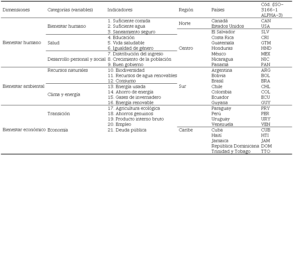 Se consideraron diferentes contextos geográficos del continente americano: Sur, Centro, Norteamérica y Caribe; la muestra utilizada comprende 25 países que fueron seleccionados por Van de Kerk y Manuel (2014). Los datos que se utilizaron se obtuvieron del sitio web de la Sustainable Society Foundation, y básicamente la información obtenida es una matriz convertida en un cubo de datos con 25 países (filas) y siete variables (columnas) medidas en seis periodos (bianuales) comprendidos entre 2006 y 2016 (Cuadro 1).