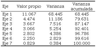 Según Galindo (1986), para una correcta interpretación del HJ-Biplot se hace necesario tener en cuenta varias medidas que son esenciales para su acertado análisis; éstas son los valores propios, la varianza explicada (Cuadro 2 y Figura 3) y la contribución relativa del factor al elemento (Cuadro 3). Con estos indicadores es posible detectar las variables responsables de la posición de los ejes y, por ende, la configuración obtenida en ellos.