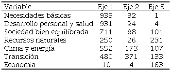 El Cuadro 3 contiene el aporte relativo de las variables a los ejes. Las variables necesidades básicas, desarrollo personal y salud, sociedad bien equilibrada, y clima y energía hacen una gran contribución al eje 1 y una baja aportación a los ejes restantes. Por el contrario, recursos naturales y economía son las variables que menos aportan en el plano factorial (ejes 1 y 2), pues no acumulan inercias superiores a 300.