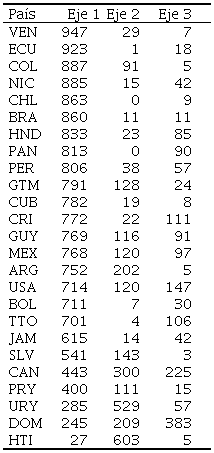 En cuanto a los individuos, es decir, los países, cuando están cerca de una variable implican que toman valores predominantes para esa variable, en el sentido de que los individuos son significativos para explicar la variable, y que ésta es de gran valor para dichos individuos. Teniendo en cuenta la contribución de los países en el plano factorial (1-2), se encontró que todos los países, excepto República Dominicana (DOM), presentan contribuciones superiores a 500.