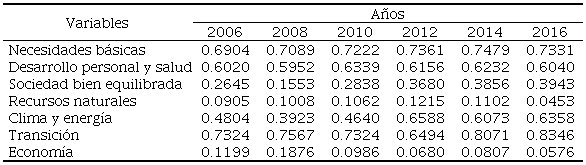 Al analizar las trayectorias de las variables, se encontró que en general son cortas y tienden a mejorar, como las categorías: sociedad bien equilibrada, necesidades básicas, transición, y clima y energía. Las categorías que poca trayectoria tuvieron durante los periodos 2006 a 2016 fueron: economía, desarrollo personal y salud. La transición tiene la trayectoria más larga y en crecimiento, seguida de necesidades básicas.