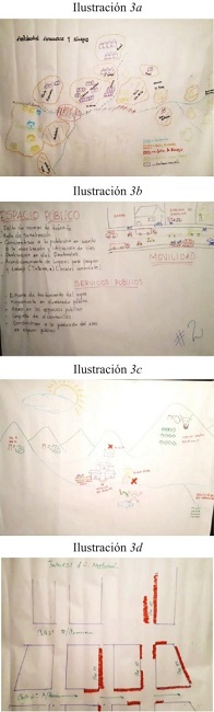 En total fueron 39 las personas que participaron en el taller, de las cuales predominó el género femenino: 25 mujeres y 14 hombres. A nivel municipal se presenta una situación recurrente y es que las mujeres asisten con mayor frecuencia a reuniones o talleres de interés colectivo. Con el objetivo de tener diferentes puntos de vista, de acuerdo al tiempo que se ha habitado el municipio, los asistentes participantes tenían entre 18 y 60 años de edad, en su mayoría en un rango de 35 a 50 años. El nivel socioeconómico fue otro factor a analizar: el municipio de El Tambo, Nariño, cuenta con tres estratos socioeconómicos y, de acuerdo con las condiciones de habitabilidad y a un estudio de estratificación del año 1996, se evidencia que prevalece el estrato 1. Finalmente, otra característica tomada en cuenta y analizada fue el nivel educativo de los participantes, encontrándose individuos con primaria básica hasta profesional, lo que permitió tener diferentes puntos de vista acordes con las características de los integrantes de cada grupo. Los resultados del taller se plasmaron a partir de la cartografía social (véase la Figura 3).