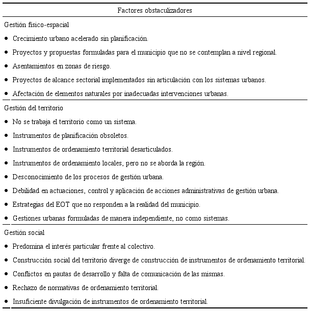 Después de analizar las dimensiones de la gestión urbana sostenible, éstas se integran para encontrar elementos comunes que permitan definir cuáles son los factores que obstaculizan la gestión urbana sostenible en el municipio de El Tambo en cada uno de los asuntos que la componen. Esta identificación e integración se relaciona en el Cuadro 1.