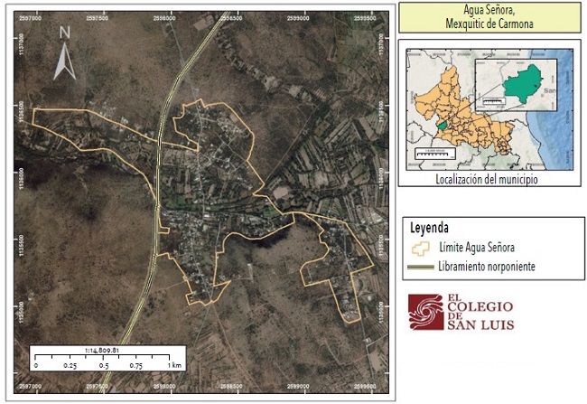 Agua Señora pertenece a Mexquitic de Carmona, uno de los 58 municipios que componen al estado de San Luis Potosí, y se ubica en la parte centro de dicho territorio. Mexquitic se subdivide en 120 localidades -89 de las cuales cuentan con menos de 500 habitantes- y, de acuerdo con el censo de 2010, poseía una población de 53 442 habitantes.8 Según esta misma fuente, los poblados de Maravillas y Estanzuela se encuentran entre las localidades más pobladas del municipio. Al igual que en Agua Señora, la generalidad de los habitantes de las localidades tiene educación básica, aunque la media superior (bachillerato) sólo se imparte en Maravillas y Estanzuela. La mayoría de las localidades cuenta con todos los servicios básicos: agua potable con tomas domiciliarias, drenaje y electricidad; no obstante, no es raro que las nuevas viviendas carezcan de diversos servicios, dado que la cobertura es deficiente.