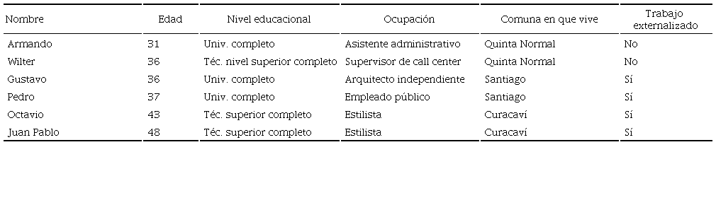 La muestra se encuentra conformada por seis hombres de entre 31 y 48 años. Armando (31) y Wilter (36) son una pareja de venezolanos que residen en Santiago desde hace dos años, ambos son trabajadores dependientes y llevan casi cuatro años de convivencia. Gustavo (36) y Pedro (37) viven juntos desde hace seis años; el primero trabaja como arquitecto independiente, mientras que el segundo es empleado público. Octavio (43) y Juan Pablo (48) son pareja desde hace 25 años, ambos son propietarios de una peluquería y dueños de varias mascotas. Gustavo y Pedro, así como Octavio y Juan Pablo, pagan para que alguien vaya a sus casas una vez a la semana para hacer el aseo general. En el caso de Armando y Wilter, es la mamá de Armando quien los ayuda en las tareas domésticas (véase el Cuadro 1).
