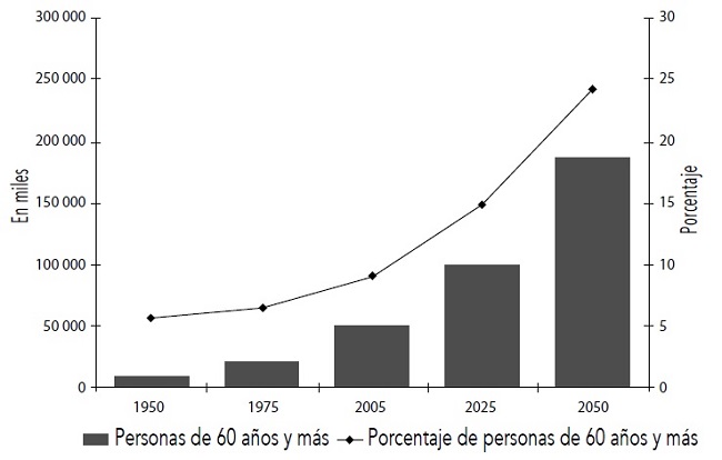 En el contexto latinoamericano, la población urbana alcanzará 87%. Y conforme las ciudades crecen, el ritmo de personas mayores va en aumento. Uno de cada cuatro latinoamericanos será una persona mayor en el año 2050; en términos absolutos, a los 41 millones existentes se sumarán 57 millones de personas mayores entre 2000 y 2025; y entre 2025 y 2050 el aumento será de 86 millones, a un ritmo medio anual de 3.5% (CEPAL, 2009). Además, se estima que el cambio generacional sea casi cuatro veces mayor que en los países desarrollados (Plouffe y Kalache, 2010) (véase la Figura 1).