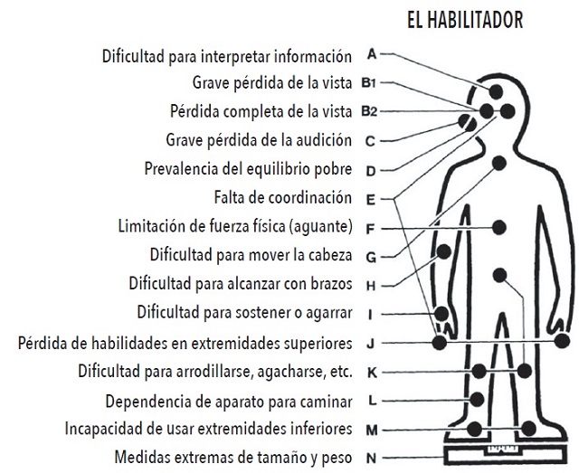 En cuanto a la conceptualización de los diseños libres de barreras dentro del marco del rendimiento humano, encontramos que la clasificación del funcionamiento humano del modelo habilitador de Steinfeld (1979) sirve como base para la operacionalización de los conflictos físicos, ya que todas las personas operan dentro de un rango de habilidades, según su edad. El ideograma habilitador (enabler) es usado como método para identificar problemas y facilitar la toma de decisiones de diseño. El modelo representa cuatro áreas generales de la discapacidad humana: a) funcionamiento mental, b) sentidos, c) regulación corporal interna, y d) discapacidad motora, que abarca 15 áreas específicas de discapacidad, y con la cual se determina el impacto que tienen las barreras ambientales en las personas con diversas limitaciones funcionales. El modelo consiste de dos partes separadas que, cuando se combinan, conceptualizan el grado de accesibilidad de un determinado entorno físico en relación con un determinado individuo. Aunque su clasificación considera la interacción bidireccional entre usuario y entorno construido, queda limitado ante todas las posibles barreras ambientales del entorno social (véase la Figura 4).