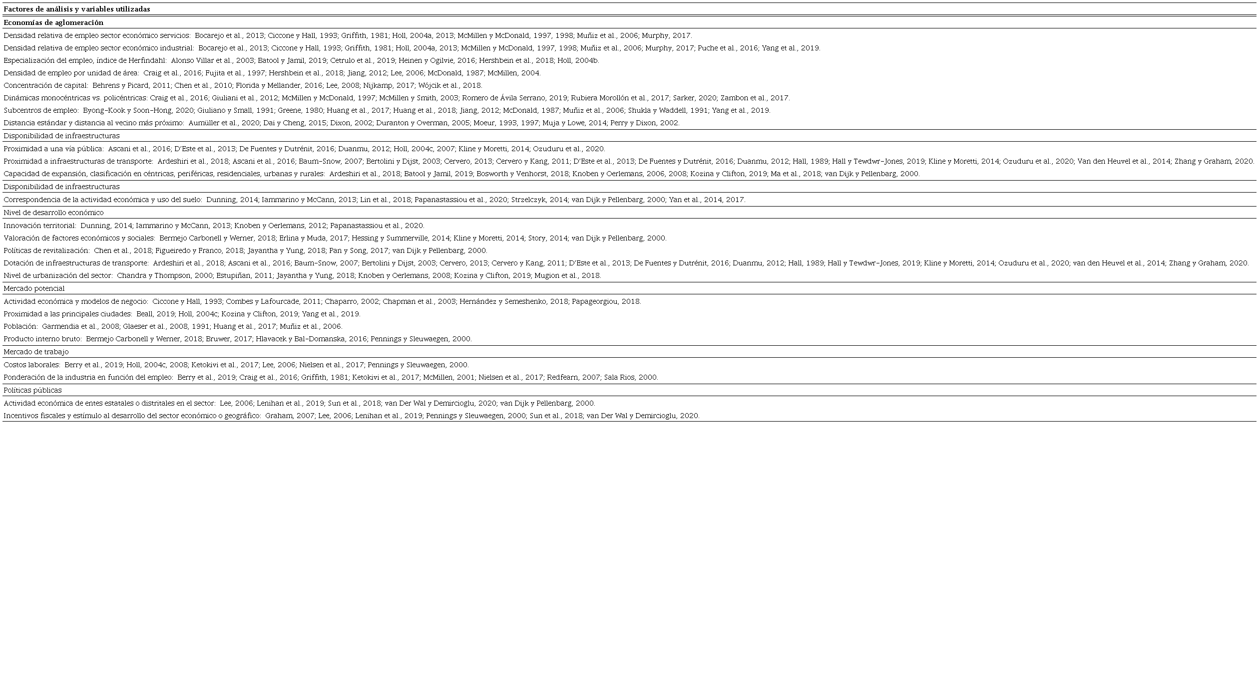 El análisis moderno de las economías de aglomeración, y de las variables que las definen, puede situarse en trabajos como los de Duranton y Puga (2004), o los de Holl (2004c) y McMillen (2004), quienes especializan el análisis incluyendo factores tales como la ubicación de la industria, la infraestructura de transporte o las particularidades de las áreas metropolitanas. Sin embargo, trabajos previos, o incluso posteriores, como los de Giuliano y Small (1991), Fujita et al. (1997), Fujita y Thisse (2003), Holl (2004b, 2004c, 2007, 2008, 2013), McMillen (2004), Litman (2010) o Cottineau et al. (2018), proponen categorías para este análisis tales como: la densidad relativa del empleo en general o por sectores económicos, la utilización de índices estadísticos espaciales para evaluar la diferenciación y la especialización de las actividades, la concentración de capital, la dinámica morfológica de las ciudades que derivan en organizaciones y territorios monocéntricos, policéntricos y especializados, y la distancia cada vez menor entre los actores del territorio.