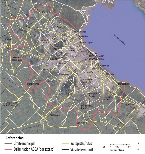 El universo espacial que así se clasifica se define como la Aglomeración Gran Buenos Aires (AGBA), que corresponde a la ciudad física o mancha urbana que se recorta en campo abierto (Mapa 1) según la definición oficial de localidad censal que se utiliza en Argentina (Vapñarsky, 1998). A pesar de la compacidad que se observa en las imágenes satelitales de la ciudad, su administración se encuentra descentralizada en dos provincias (entidades político-administrativas de segundo orden) y más de una treintena de municipios (entidades político-administrativas de orden local), que gestionan sin coordinación de nivel metropolitano un territorio de aproximadamente 246 mil hectáreas (Rodríguez y Kozak, 2014) y 13 588 171 personas (INDEC, 2010a), atravesado por profundas desigualdades.