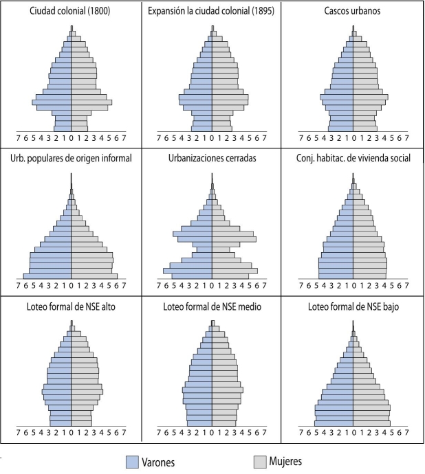 En el caso de las tipologías asociadas a las centralidades históricas (ciudad colonial, expansión de la ciudad colonial y cascos urbanos), interesa destacar el gran envejecimiento relativo, la dinámica de atracción de población en el rango etario que va de los 20 a los 40 años y la preponderancia de población muy instruida, todos rasgos propios de áreas centrales tempranamente pobladas, en las que se mixturan usos del suelo diversos. Las áreas centrales tienen entonces condiciones demográficas para una dinámica de rotación de las viviendas mucho más acelerada que otros contextos (por disolución de hogares de ancianos y reingreso de las viviendas al mercado -aunque no necesariamente inmediato ni para uso residencial-) y constituyen un lugar atractivo para la vida laboral intensa en los primeros años de adultez.