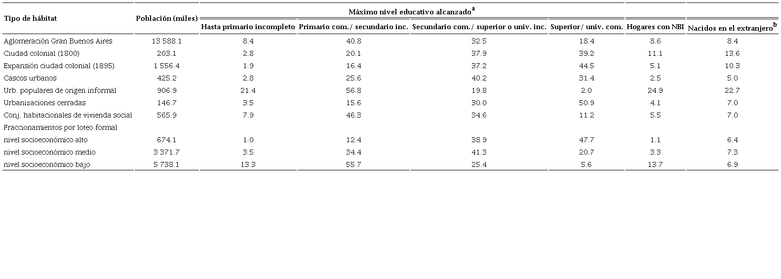 Palabras clave: tipos de hábitat, poblamiento, mercados de localización, estructura demográfica, estructura urbana, vivienda, área metropolitana, Buenos Aires.