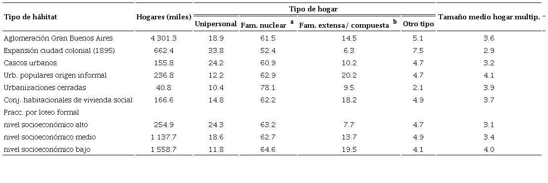 Por último, partiendo de un concepto de vivienda amplio, que trasciende el recinto de alojamiento, para incluir el peridomicilio y la comunidad barrial (vecindario), se ha propuesto indagar tanto en la morfología de los hogares como en las características del parque de viviendas, a través de indicadores tales como tamaño del hogar, tipo de hogar, tipo de vivienda, condición de ocupación de la vivienda, calidad constructiva y acceso a diferentes infraestructuras y servicios urbanos. Ello estará precedido de una imprescindible caracterización sociodemográfica general de los tipos de hábitat con base en indicadores de la estructura de su población, y de una contextualización histórica del proceso de poblamiento metropolitano que contribuye a su interpretación.