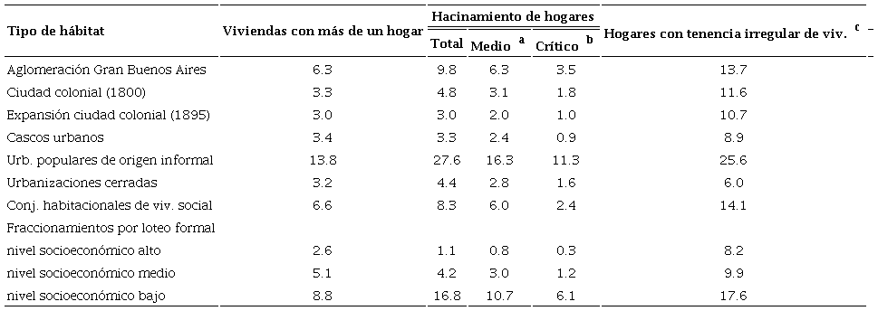 Abstract: Habitat types are urban environments resulting from the settlement process of the city and the forms of production of the living space. The article aims to investigate the way in which habitat types are linked to the demographic profile, the characteristics of the housing stock and the metropolitan location market in Buenos Aires, based on recent census data. As a result, the housing conditions are des-cribed in the light of the genetic variants of the settlement process, and the contrasts, similarities, hierarchies and distances among urban environments are highlighted.