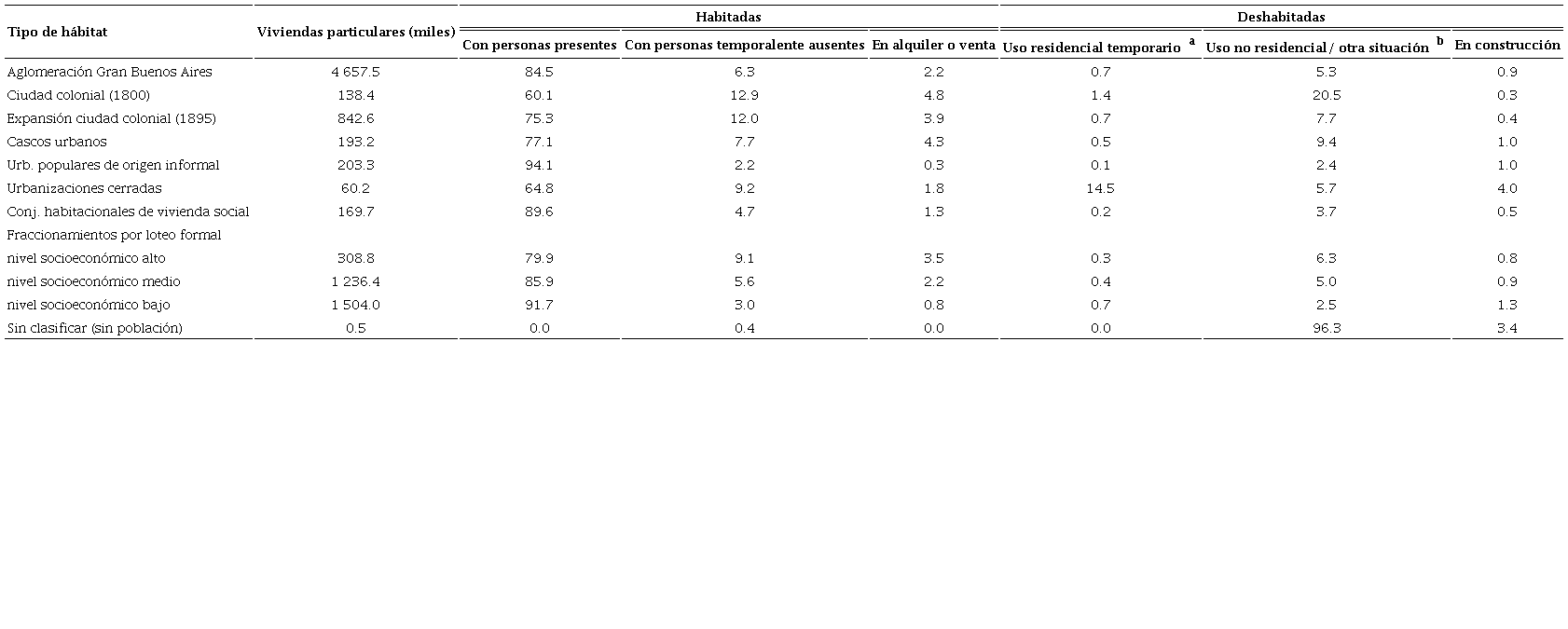 Los datos relativos a la condición de ocupación del parque de viviendas particulares en los tipos de hábitat son interpretados aquí como indicios de los vínculos existentes entre contextos residenciales, usos del suelo y dinámicas de transformación en curso.