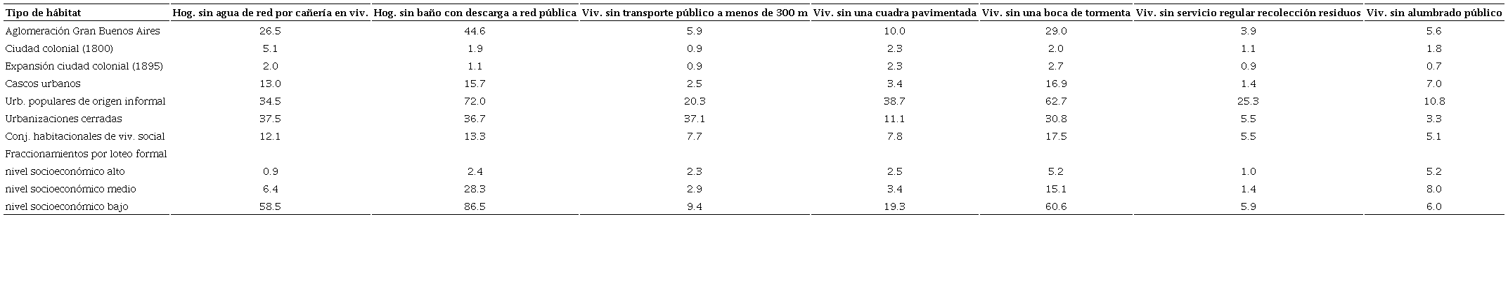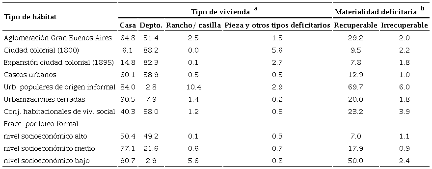 El análisis del parque de viviendas y su entorno inmediato en los tipos de hábitat muestra los efectos -del lado de la oferta- del mercado de localizaciones residenciales: las características diferenciales del parque de viviendas (su tamaño, uso, tipología y calidad material -Cuadros 4 y 5-) y del acceso a los servicios urbanos derivado de su emplazamiento (Cuadro 6), que se han configurado a partir de arreglos institucional-mercantiles relacionados con el uso del suelo urbano.