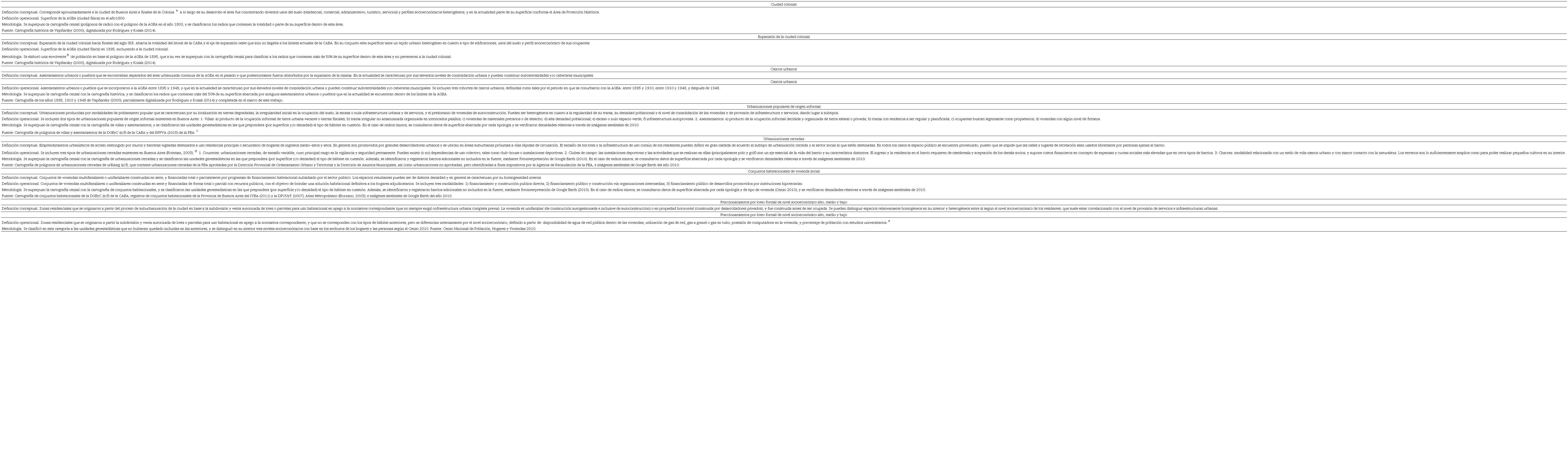 En términos operativos, la adaptación de esta herramienta teórica al caso de Buenos Aires (Marcos, 2019) da lugar a la clasificación de la ciudad en su núcleo colonial primario, su primera expansión, viejos cascos urbanos otrora independientes que se han conurbado, urbanizaciones populares de origen informal, urbanizaciones cerradas, conjuntos habitacionales de vivienda social y fraccionamientos por loteo formal de distinto nivel socioeconómico.