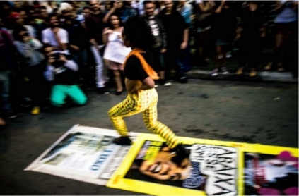 Las pornotopías coexisten con otros dispositivos que en los últimos años han decaído políticamente como en la conmemoración del orgullo. En São Paulo, el impulso de marchas alternativas que promueven la visibilidad de cuerpos olvidados, como la Caminhada de Mulheres Lésbicas e Bissexuais16 y la Marcha do Orgulho Trans17 (Fotografía 3), cerca de la marcha del orgullo LGBTQ “oficial”, o incluso la manifestación-fiesta A Revolta da Lâmpada18 (Fotografías 4 y 5) son casos ilustrativos. Los despliegues de contramarchas en distintas metrópolis argentinas durante este día también reafirman estas pornotopías de resistencia.