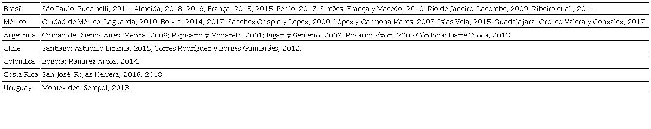 El Cuadro l muestra un intento de estructurar un estado de la cuestión. Evidentemente queda mucho por recorrer y se esperan aportes que nutran el gráfico mediante más estudios de la diversidad sexual latinoamericana. Del conjunto relevado, los esfuerzos por parte de los geógrafos han sido mínimos (en algunos países nulos). En cuanto a la dimensión espacial, destacan los análisis etnográficos (en marchas, bares, baños, saunas, zonas cruising) con una perspectiva que busca historizar a la comunidad y su contexto: las cartografías de sociabilidad, las jergas y las narrativas sobre la base de la observación participante y las entrevistas en profundidad. Por otro lado, existen mayores despliegues en torno a las subjetividades y prácticas homosexuales/gays en comparación con las de lesbianas y personas travestis/trans, pivoteando entre distintas espacialidades construidas del orden social, erótico (en su mayoría) y político.