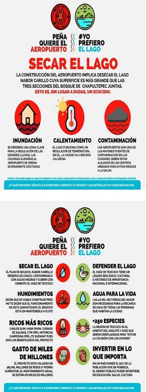 La destreza de los opositores consistió en la vinculación de su causa con el mayor problema de la humanidad: la crisis ecológica. De ahí que la campaña “Yo prefiero el Lago”, iniciativa del FPDT y la Asamblea Autónoma de los Pueblos de la Cuenca de México, explicara de manera sencilla con un gran número de imágenes tanto los daños ambientales derivados de la construcción del nuevo aeropuerto, como los intereses económicos y políticos detrás de éste, además de denunciar la destrucción del patrimonio arqueológico y cultural (véase la Imagen 1). La campaña buscaba “Hackear el Aeropuerto”9 a favor de las anteriores causas, apoyándose en las llamadas redes sociales para informar e invitar a otras personas a sumarse a su proyecto.