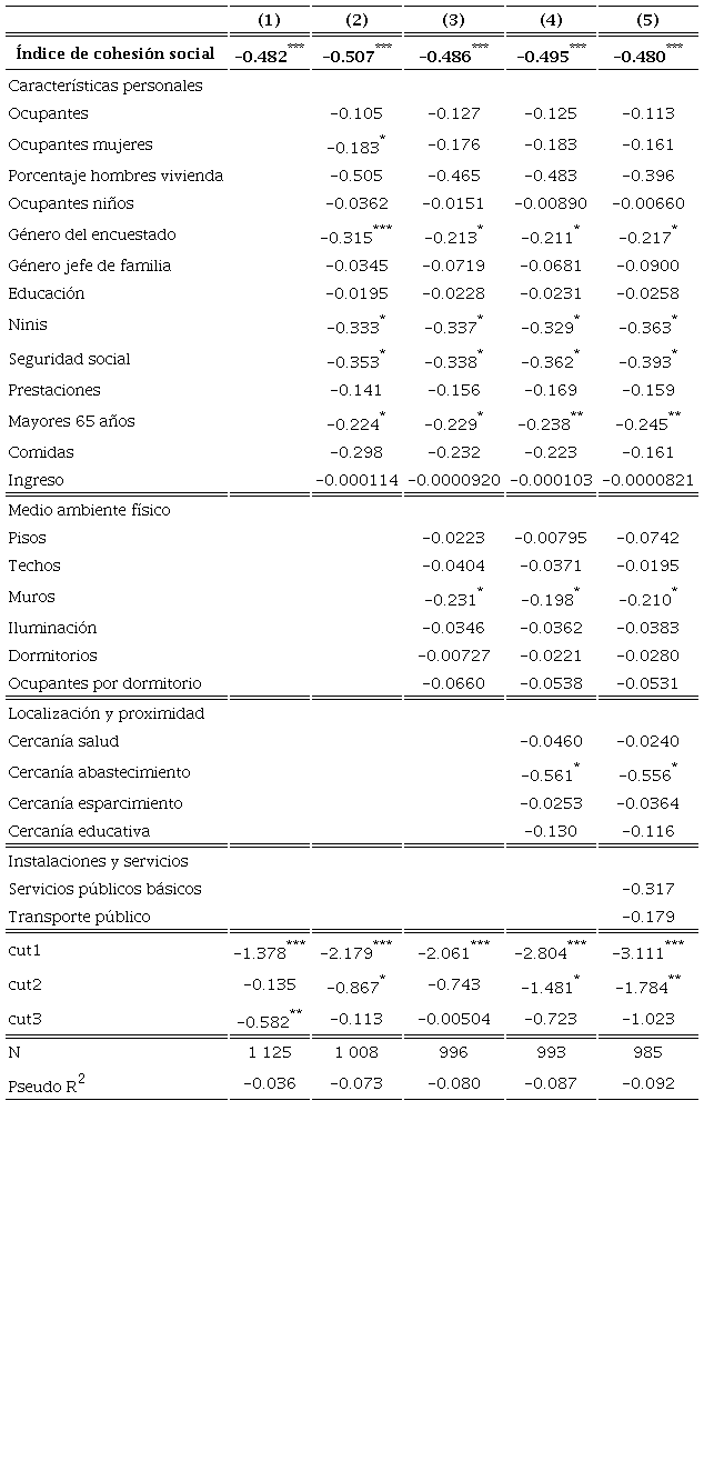 El coeficiente del índice de cohesión social es estadísticamente significativo en los cinco modelos, manteniendo consistencia tanto en el signo negativo como en su magnitud, a pesar de la presencia de diferentes grupos de variables de control en las estimaciones por probit ordenado (Cuadro 1). Siendo un modelo con variables categóricas, el signo negativo asociado al coeficiente del índice de cohesión, indica que cuando esta variable aumenta en una unidad, la probabilidad de que el entrevistado se sienta muy bien en su colonia -la opción 1 de la pregunta 12 del cuestionario- se incrementa, y la probabilidad de que se sienta muy mal se reduce -la opción 4 de la pregunta 12 del cuestionario-. Esto es, al mejorar la cohesión social, mejora también, en el sentido probabilístico, la satisfacción con la colonia.