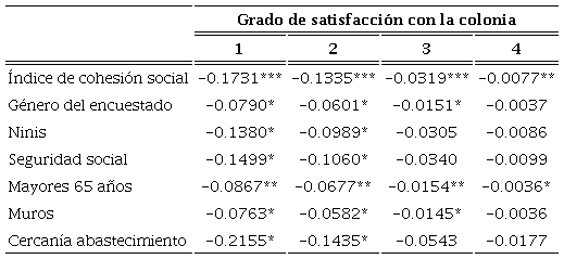 Nuestros resultados revelan clara evidencia de que, mejorando la cohesión social, aumenta la probabilidad de que los residentes se muestren satisfechos con su colonia. El resultado es consistente tanto a variaciones del método de estimación como a los grupos de variables de control considerados. En efecto, el índice de cohesión social se mostró estadísticamente significativo en todos los modelos estimados, aun en los efectos marginales calculados con la estimación por probit ordenado.