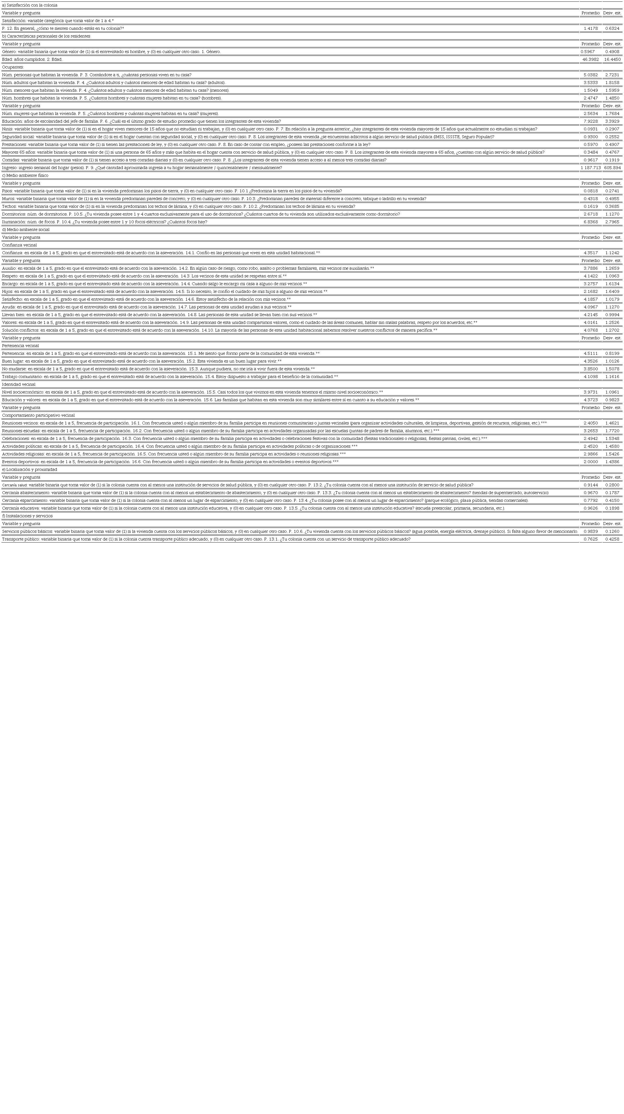 Nuestro trabajo aporta a la literatura que acabamos de presentar en dos sentidos: en relacionar el indicador de cohesión social -que incluye 22 aspectos, agrupados en cuatro dimensiones- y el grado de satisfacción con la colonia; y en estudiar los determinantes de una dimensión de la satisfacción residencial en comunidades de ingreso bajo. No tenemos conocimiento que este tipo de análisis se haya realizado anteriormente en México.