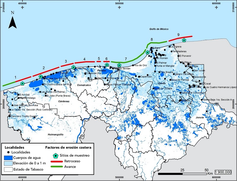 Los datos georreferenciados de las localidades de Tabasco fueron sobrepuestos con el mapa del modelo digital de terreno utilizando el software ArcMap 10.0. Se utilizaron los datos de población de las localidades identificadas en el área de estudio para estimar la población que se vería afectada. Al análisis se le agregó la información de tasas de erosión y acumulación (Cuadro 1), construyendo un buffer utilizando el software ArcMap 10.0 por región, conforme a lo estimado con los datos de Ortiz-Pérez y Méndez-Linares (1999), Ortiz-Pérez y Gama (2019) y Hernández-Santana, Ortiz-Pérez, Méndez-Linares y Gama-Campillo (2008), que va de 0.77 en el sector 1 a 3.5 m en el sector 9 para las tasas de retroceso detalladas en Ortiz-Pérez, Hernández-Santana, Figueroa y Gama (2010). Sólo se consideraron las zonas que presentaban tasas de retroceso de línea de costa y no las que presentaban avances, quedando fuera parcialmente el sector 1, que corresponde al delta del río Tonalá, y los sectores 7 y 8 en el delta del río Usumacinta.