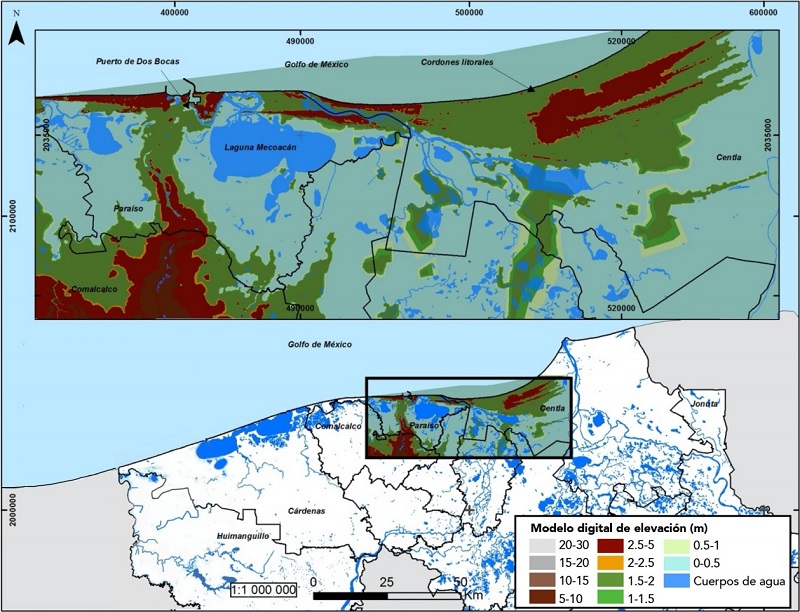 Desde 2009, Williams y Gutierrez señalaron que se deberían estar planificando acciones y realizando evaluaciones exhaustivas considerando los cambios en el nivel del mar de 1 m o más para el año 2100, los cuales afectarán zonas importantes de concentración de población. Con base en la información satelital existente de puntos LiDAR para la costa tabasqueña, transformada en cotas de elevación cada 50 centímetros, y el escenario global estimado RCP 8.5 (Representative Concentration Pathway, ruta representativa de concentración de gases de efecto invernadero) del IPCC (2019) para el año 2100, de 0.84 m, se consideró como zona de interés la cota entre cero y un metro de elevación por su potencial de impactos asociados a la elevación media del nivel del mar.