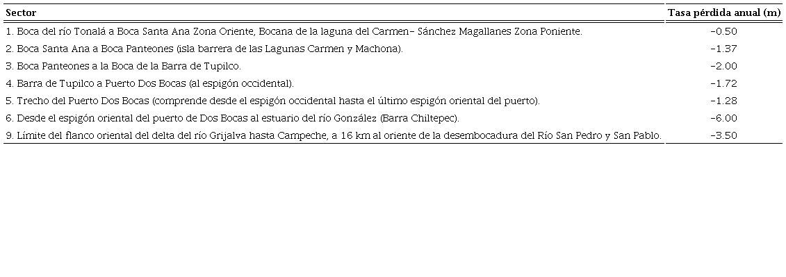 La zona costera tabasqueña, debido a la dinámica de las actividades productivas, ha sufrido una importante alteración que rompe con la dinámica natural que garantice su funcionalidad, reportada desde el siglo pasado (Tudela, 1992). Los cambios de uso del suelo, así como la modificación de la hidrodinámica, han contribuido a transformar los procesos naturales del paisaje tabasqueño (Gama, Collado, Díaz-López y Moguel Ordóñez, 2019), disminuyendo su capacidad de amortiguar las amenazas asociadas a eventos tanto de origen natural como antrópico, y con ellos el cambio climático. Esto se aprecia en el incremento de las tasas de erosión en el litoral tabasqueño, que están afectando ya directamente los bienes de la población. Estos impactos, además de resultar en la pérdida de territorio, alterarán los sistemas ambientales costeros y su capacidad de brindar bienestar. Sin embargo, autores como Grenfell, Callaway, Grenfell, Bertelli, Mendzil y Tew (2016) consideran que estos cambios y sus efectos, como es la pérdida de biodiversidad, podrían no ser visibles este siglo.