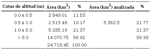 Para este análisis se identificó la extensión de territorio vulnerable a impactos asociados al incremento del nivel medio del mar entre 0 y 1 metro de altitud. Tabasco tiene casi la mitad de su extensión territorial entre 0 y 5 msnm, donde 21.7% (5 362.5 km2) (Cuadro 2) está entre 0 y 1 msnm (Mapa 1). Sin embargo, sólo 423.4 km2 (7.89%) de ese rango tiene cercanía a la línea de costa; el resto de las extensiones identificadas en esta cota se encuentran limitadas por barreras físicas o en zonas bajas tierra adentro. En el Mapa 2 se pueden identificar los cordones litorales del delta del río Usumacinta cercanos a la costa con elevaciones entre 2.5 y 5 m.