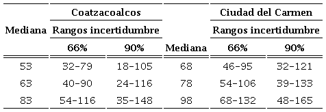 Utilizando las estaciones mareográficas de Coatzacoalcos y Ciudad del Carmen, con la herramienta Climate Analytics (https://http://localslr.climateanalytics.org/) (Cuadro 3) se encontró que para el año 2100, dependiendo de las acciones de mitigación implementadas para el cumplimiento del Acuerdo de París, el nivel de elevación del mar para Coatzacoalcos estaría entre 0.32 y 1.48 m, y para Ciudad del Carmen entre 0.46 y 1.65 m.