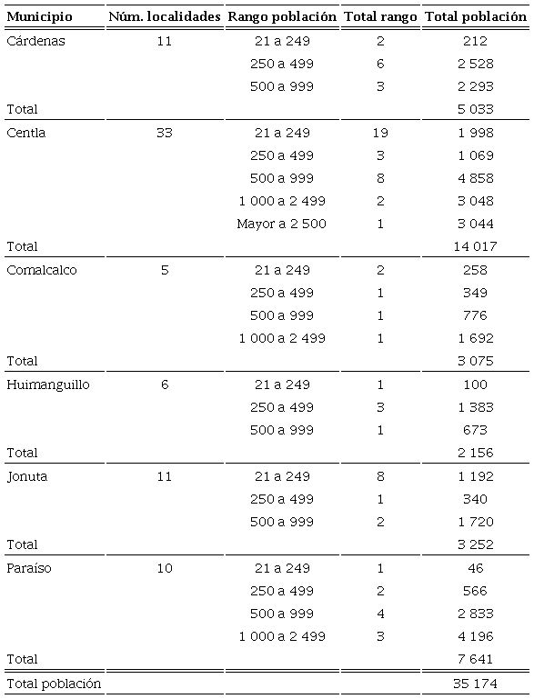 En los trece municipios que corresponden al 83.39% del estado y que son considerados como de influencia costera -Balancán, Cárdenas, Centla, Centro, Comalcalco, Cunduacán, Emiliano Zapata, Huimanguillo, Jalpa de Méndez, Jonuta, Nacajuca, Macuspana y Paraíso- (Gobierno de México, 2012), habita más del 90% de la población de Tabasco. En éstos se localizan 2 370 localidades (estimadas como lugares ocupados con más de diez viviendas habitadas); sin embargo, no todas tienen cercanía al litoral costero.