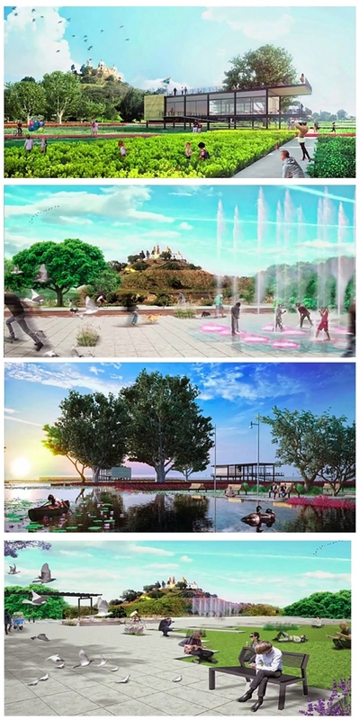 Con el pretexto de “rescatar” y “dignificar” la zona arqueológica, el proyecto se propuso “crear un parque sustentable en donde se puedan realizar actividades culturales, deportivas, recreativas y de esparcimiento para la población y sus visitantes” (Gobierno Municipal de San Pedro Cholula, 2014). El proyecto original consideraba la construcción de un foro al aire libre, canchas deportivas, áreas para el desarrollo de actividades recreativas, un andador temático cultural, jardines y espejos de agua (Figura 1). Se llegó a hablar incluso de la recreación de chinampas prehispánicas en un lago artificial que sería construido para tal fin (Gámez et al., 2016).