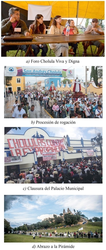 No obstante, por su valor simbólico, el principal acto de protesta que se llevó a cabo fue la procesión de rogación que organizaron los principales, tiaxcas, mayordomos y fiscales de San Pedro y San Andrés Cholula, acto inusual al que, históricamente, han recurrido los barrios de Cholula ante situaciones de crisis. Consiste en una procesión encabezada por la Virgen de los Remedios en la que participan las autoridades tradicionales de cada uno de los barrios, las cuales enarbolan las imágenes de sus santos y vírgenes. El objetivo es solicitar el amparo y protección de la divinidad ante una situación de emergencia. La última ceremonia de este tipo se había realizado en Cholula hace más de cien años para pedir el auxilio de la Virgen durante una sequía (Ramírez et al., 2016). El 3 de octubre de 2014, durante más de seis horas, la procesión de rogación recorrió las calles de San Pedro y San Andrés Cholula, haciendo “paradas” en los palacios municipales de ambas demarcaciones, así como en los terrenos que habían sido expropiados.
