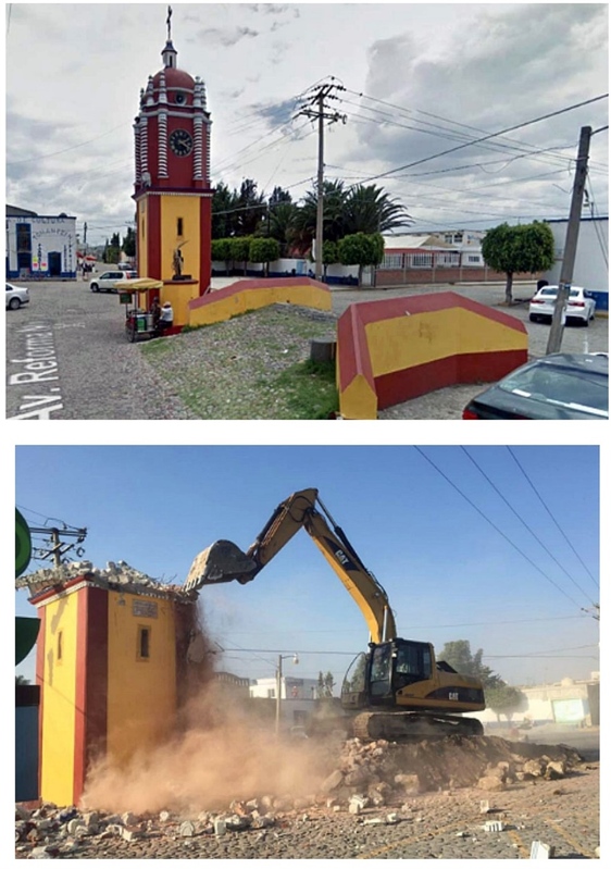 A principios del mes de enero de 2018, con el pretexto de “rehabilitar” y “adecuar” la explanada central de Tonantzintla, se introdujo maquinaria pesada para levantar el empedrado y derribar un puente de piedra y una torre que se ubicaban en la plaza central, justo frente a la iglesia. Muy pronto se supo que dichas obras formaban parte del proyecto de creación de un “Barrio Smart” (Figura 5).