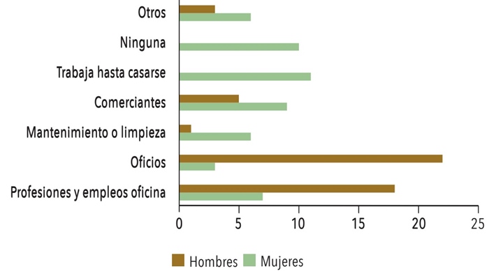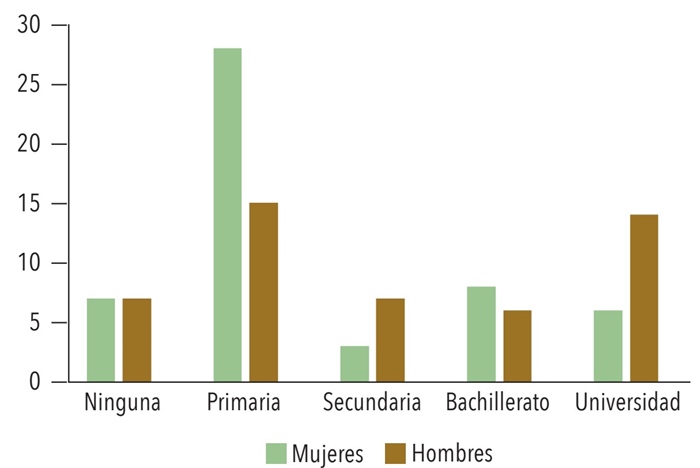 En las narrativas de las y los entrevistados se observa una incorporación de representaciones sociales hegemónicas sobre el género. En las Gráficas 1 y 2 se muestra que las mujeres tuvieron menores niveles de escolaridad que los varones y que algunas no ejercieron ningún empleo o que lo dejaron al contraer matrimonio. En las entrevistas manifestaron que desearon dedicarse de tiempo completo a las labores domésticas y crianza de los hijos. Las mujeres que ejercieron un empleo después de casarse mantuvieron la doble jornada de trabajo; aquéllas con menores niveles educativos y recursos económicos se emplearon como comerciantes y trabajadoras de mantenimiento o limpieza; quienes accedieron a mayores niveles de instrucción ejercieron profesiones y diversos trabajos de oficina. Por su parte, las trayectorias laborales de los varones estuvieron principalmente marcadas por el nivel educativo y estrato socioeconómico: los hombres con mayores recursos y niveles educativos se emplearon en oficinas y como profesionistas; mientras que aquéllos con menores niveles de instrucción y menos ingresos ejercieron oficios. En sus narrativas se presentan como responsables del sustento familiar y de la adquisición de la vivienda. La mayoría de las mujeres participantes delegó la responsabilidad de la búsqueda y adquisición de casa a sus parejas.