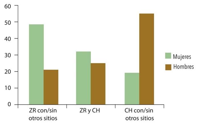 El análisis de contenido de las narrativas sobre los lugares citados y la forma de los mapas nos permitió detectar varios patrones de representación socioespacial de la Ciudad de México en función de la diferencia de género. El Centro Histórico y el lugar de residencia fueron los principales referentes espaciales en la elaboración de sus dibujos. Con el objetivo de observar el porcentaje de mapas que se concentraban en la zona de residencia o en el Centro Histórico, éstos se dividieron en tres grandes categorías: los mapas que incluían la zona de residencia (ZR) con y sin otros sitios que no fueran el Centro Histórico (CH), los mapas que incluían la zona de residencia y el Centro Histórico, y aquellos que incluían al Centro Histórico con y sin otros sitios que no fueran la zona de residencia. Posteriormente se calcularon las diferencias por género (véase la Gráfica 3).