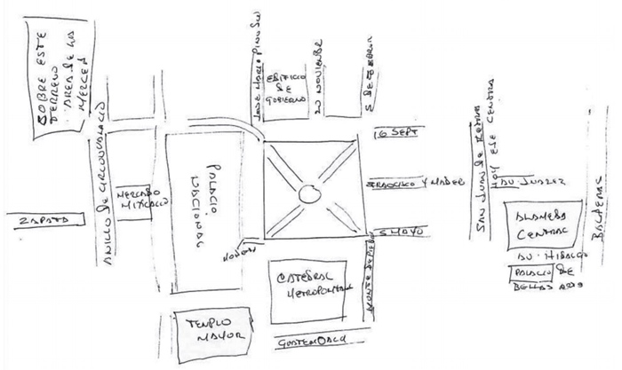 La imagen de la ciudad de algunas y algunos entrevistados se focalizó únicamente en el centro, extendido frecuentemente hacia Chapultepec, siguiendo el eje de Reforma, como se observa en los dibujos de Juan (Figura 1) y Hemigdio (Figura 2). Ambos vivían en Ixtapaluca y visitaban el centro con poca frecuencia; ellos advirtieron que su mapa correspondía a la ciudad de su juventud y no a la ciudad actual. Existe una desconexión con los lugares de la ciudad que más les gustaban y los que frecuentaban en el momento de la entrevista. Es importante notar que Juan acotó su mapa al núcleo central de la ciudad, a pesar de circular intensamente por ella, debido a que trabajaba como taxista. Es como si hubiera decidido concentrar su representación simbólica de un espacio extenso y complejo, que conocía bien, a los territorios que recorrió siendo joven y que simbolizan el origen histórico de la urbe.