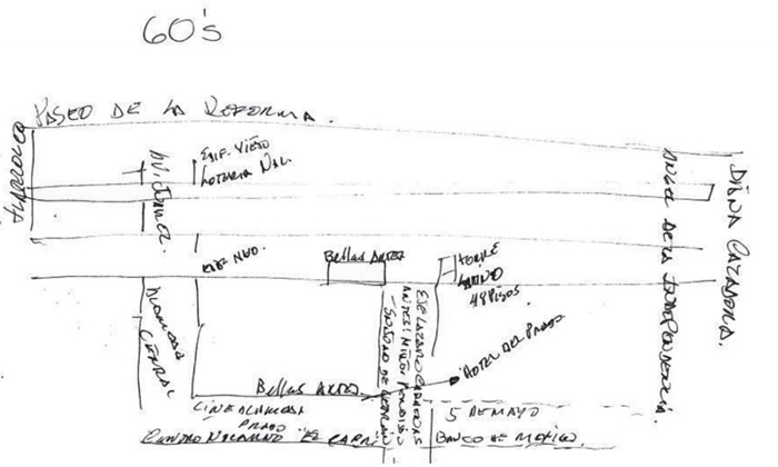 Emigdio hacía recorridos menos frecuentes por la ciudad, a pesar de que era vendedor de seguros. También decidió representar los lugares en donde solía divertirse cuando era joven, en la década de los sesenta, como lo escribe en su mapa. Es uno de los raros mapas en los que la Plaza de la Constitución no aparece como punto organizador del dibujo. Esa función la cumple la avenida Paseo de la Reforma (entre la rotonda de la Diana Cazadora y la Unidad Habitacional Tlatelolco), donde él mencionó que se encontraban los centros nocturnos, bares, cafés y restaurantes que frecuentaba en su juventud. Comentó que el área turística de moda en la época se ubicaba en el sector de la Zona Rosa y del Ángel de la Independencia. También desarrolló en su mapa el área de la Alameda, Bellas Artes, avenida Juárez y Eje Central Lázaro Cárdenas, recordando que este último antes llevaba el nombre de Niño Perdido. Evocó el esplendor de esa zona antes del terremoto de 1985. Insertó en su mapa lugares que desaparecieron en ese momento, como el Hotel del Prado, el centro nocturno El Capri, y el Cine Alameda. Su mapa mental y sus narrativas sobre la ciudad tienen un sabor nostálgico, que fue compartido por los demás informantes.