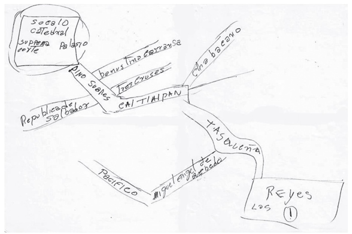 Algunos mapas muestran una conexión entre la ciudad y las colonias de residencia de las y los entrevistados. Esta conexión corresponde a recorridos presentes o pasados que se realizaron con mucha frecuencia y que tenían un significado importante en sus vidas. Félix (Figura 3) dibujó el recorrido al centro que hacía desde pequeño, cuando iba a vender al mercado de La Merced las verduras que cultivaba su familia en el Pueblo de Los Reyes, en Coyoacán. Hasta el momento de la entrevista, Félix seguía haciendo el mismo recorrido, aunque no con el mismo propósito. Todos los sábados iba a La Merced a hacer sus compras de fruta y verdura, combinaba microbús, taxi y Metro para ir y venir, mientras que antaño lo hacía en autobuses urbanos que llegaban al Zócalo. A pesar de que Félix laboró en diversas zonas como trabajador de la construcción, su imagen de la ciudad se concentra en el recorrido sabatino de toda su vida al centro, conectando el lugar en donde siempre ha vivido y los sitios más representativos del Centro Histórico.