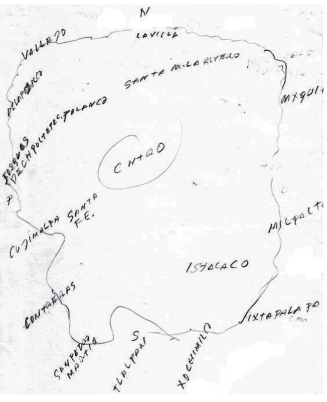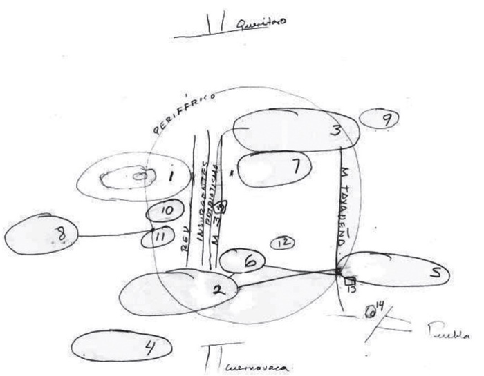 Otros mapas representan la ciudad como un conjunto de zonas que no están conectadas por calles ni avenidas. A veces se trata de reproducir la división de delegaciones (ahora alcaldías) o municipios de la zona metropolitana, en otras sólo se hacen círculos que simbolizan áreas vinculadas con la vida personal o laboral. Es el caso de Pedro, residente de la colonia Evolución, en Nezahualcóyotl, quien recorrió intensamente la ciudad durante muchos años porque trabajó como mensajero en un banco. En su mapa (Figura 5), el centro simboliza el núcleo de la mancha urbana que vio crecer a lo largo de su vida laboral. Excluyó de su mapa su lugar de residencia.