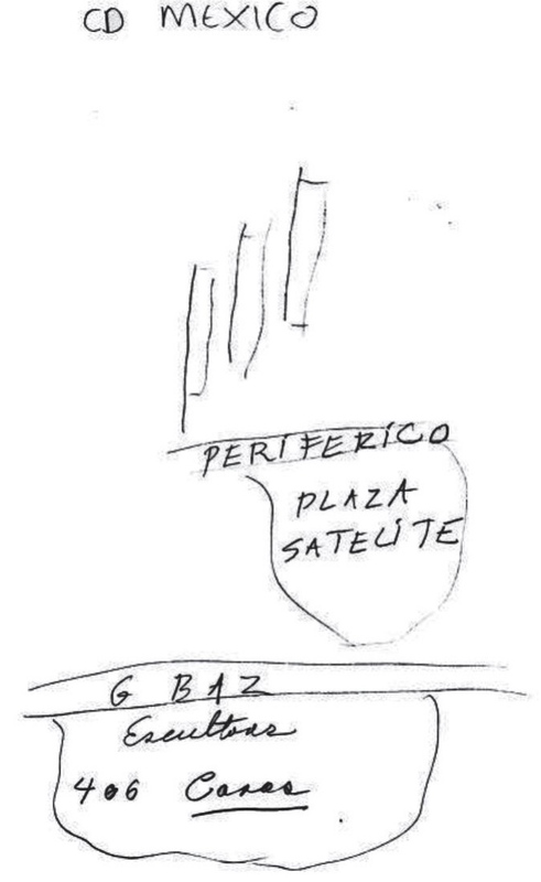 A pesar de que la instrucción fue dibujar un mapa de la ciudad, varios entrevistados, particularmente las mujeres, sólo dibujaron un mapa de su zona de residencia actual o alguna que fue significativa en el pasado. En el mapa de Paz (Figura 6), un ama de casa de 73 años, residente en Ciudad Satélite, vemos que intitula su croquis “CD MEXICO”; sin embargo, sólo dibuja las Torres de Satélite, el Periférico, Plaza Satélite, la vía Gustavo Baz y el Circuito Escultores, que según ella cuenta con 406 casas. Desde hace décadas la señora Paz, como muchos otros entrevistados, había circunscrito su actividad cotidiana al fraccionamiento y a las zonas aledañas a éste.
