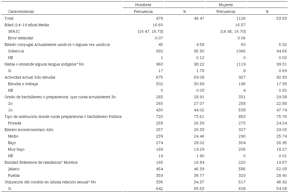 La fuente de información utilizada fue la Encuesta sobre Noviazgo, Empoderamiento y Salud Sexual y Reproductiva en Adolescentes Estudiantes de Preparatoria en México (Enessaep), levantada en 2014 con muestras aleatorias y representatividad en Jalisco, Morelos y Puebla (Casique, 2018). Cabe mencionar que esta encuesta incluye preguntas novedosas, ya que además de tener información acerca de las características individuales de los jóvenes y de la pareja sexual, también contiene datos detallados sobre los roles de género y la relación de noviazgo, entre otros. Además, la sección de salud sexual y reproductiva proporciona información detallada sobre la vida sexual del adolescente, así como sobre las actitudes y las condiciones en las que se dieron los encuentros sexuales. Dicha encuesta tiene un enfoque de género, en el cual el eje central es el empoderamiento y su relación con la violencia de la pareja, la coerción sexual, y la salud sexual y reproductiva de los adolescentes. La muestra total fue de 13 427 estudiantes de preparatoria de 14 a 19 años (5 287 de Morelos, 4 490 de Jalisco y 3 650 de Puebla). En el presente trabajo la población de estudio fueron 2 104 adolescentes que tuvieron relaciones sexuales doce meses antes de la encuesta con su novia/o, pareja, free o amiga/o con derechos.