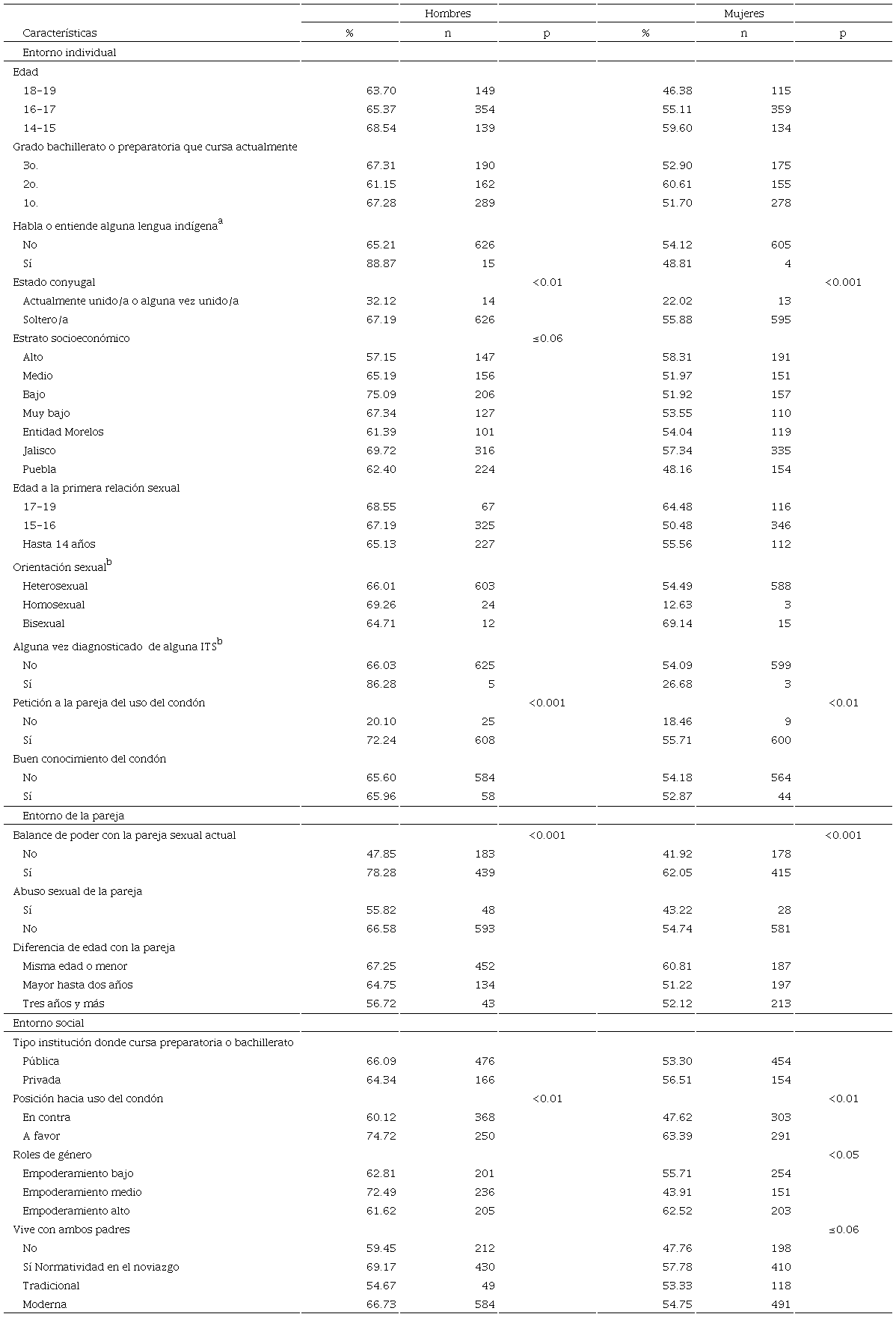 En el Cuadro 2 se presentan los aspectos del entorno individual, de la pareja y social de hombres y mujeres adolescentes de acuerdo con la utilización del preservativo en la última experiencia sexual. En el entorno individual, en los dos sexos se observaron diferencias en la utilización del preservativo en la última experiencia sexual en relación con el estado conyugal, con una mayor proporción de uso en las personas solteras (67.2% de los solteros y 32.1% de los unidos, p<0.001; y 55.9% de las solteras y 22.0% de las unidas, p<0.01), y en la petición a la pareja de su utilización, con porcentajes más altos en los que sí lo pidieron (72.2% vs. 20.1% en varones, p<0.001; y 55.7% vs. 18.5% en mujeres, p<0.01). Sólo en el caso de los hombres se encontraron diferencias marginales en la utilización del preservativo por estrato socioeconómico (57.2% en el estrato alto, 65.2% en el medio, 75.1% en el bajo y 67.3% en el muy bajo, p ≤0.06).