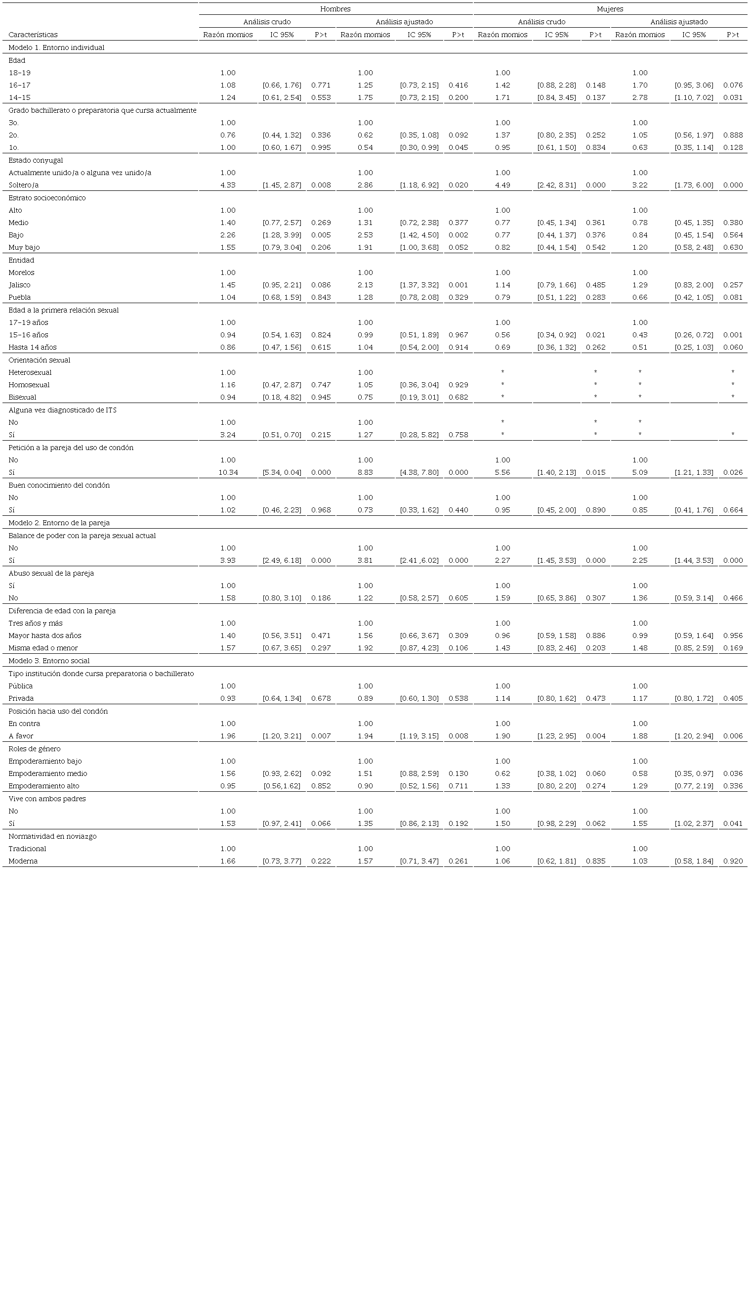 En el Cuadro 3 se presentan los resultados de los modelos estadísticos multivariados en cada uno de los entornos de la población adolescente por sexo. En el caso de los hombres, se observa en el entorno individual (modelo 1) que aquellos que cursan el primer grado de bachillerato tienen menos posibilidad de utilizar el preservativo respecto a los que cursan el último grado (RM=0.54, p<0.05). En cambio, los solteros tienen mayor posibilidad de utilización respecto a los unidos (RM=2.86, p<0.05). Respecto al estrato socioeconómico, hay más posibilidad de utilización del preservativo en los varones que pertenecen al estrato socioeconómico bajo (RM=2.53, p<0.01) y muy bajo (RM= 1.91, p<0.05) en comparación con el estrato más favorecido. Los hombres que viven en Jalisco tienen mayor posibilidad de uso respecto a los de Morelos (RM=2.13, p<0.01). Destaca que la mayor posibilidad de utilización del condón se presenta cuando los varones opinan que pedirían a la pareja usarlo (RM=8.83, p<0.001). En este mismo entorno, en las mujeres se observa que las más jóvenes tienen mayor posibilidad de protegerse con el preservativo respecto a las de mayor edad (RM=2.78, p<0.05), así como las mujeres que son solteras en comparación con las que están unidas (RM=3.22, p<0.01). A diferencia de los varones, la edad a la primera relación sexual fue relevante para la protección anticonceptiva. De esta forma, aquellas que iniciaron su vida sexual entre los 15 y 16 años tienen menos posibilidad que las que la iniciaron más tardíamente (RM=0.43, p<0.01). Con significancia estadística marginal se encontró esta misma tendencia en el grupo de edad de las menores de 15 años (RM=0.51, p≤0.06). Por último, hay mayor protección cuando existe una opinión positiva de las estudiantes sobre pedirle a su pareja el uso del preservativo (RM=5.09, p<0.05).