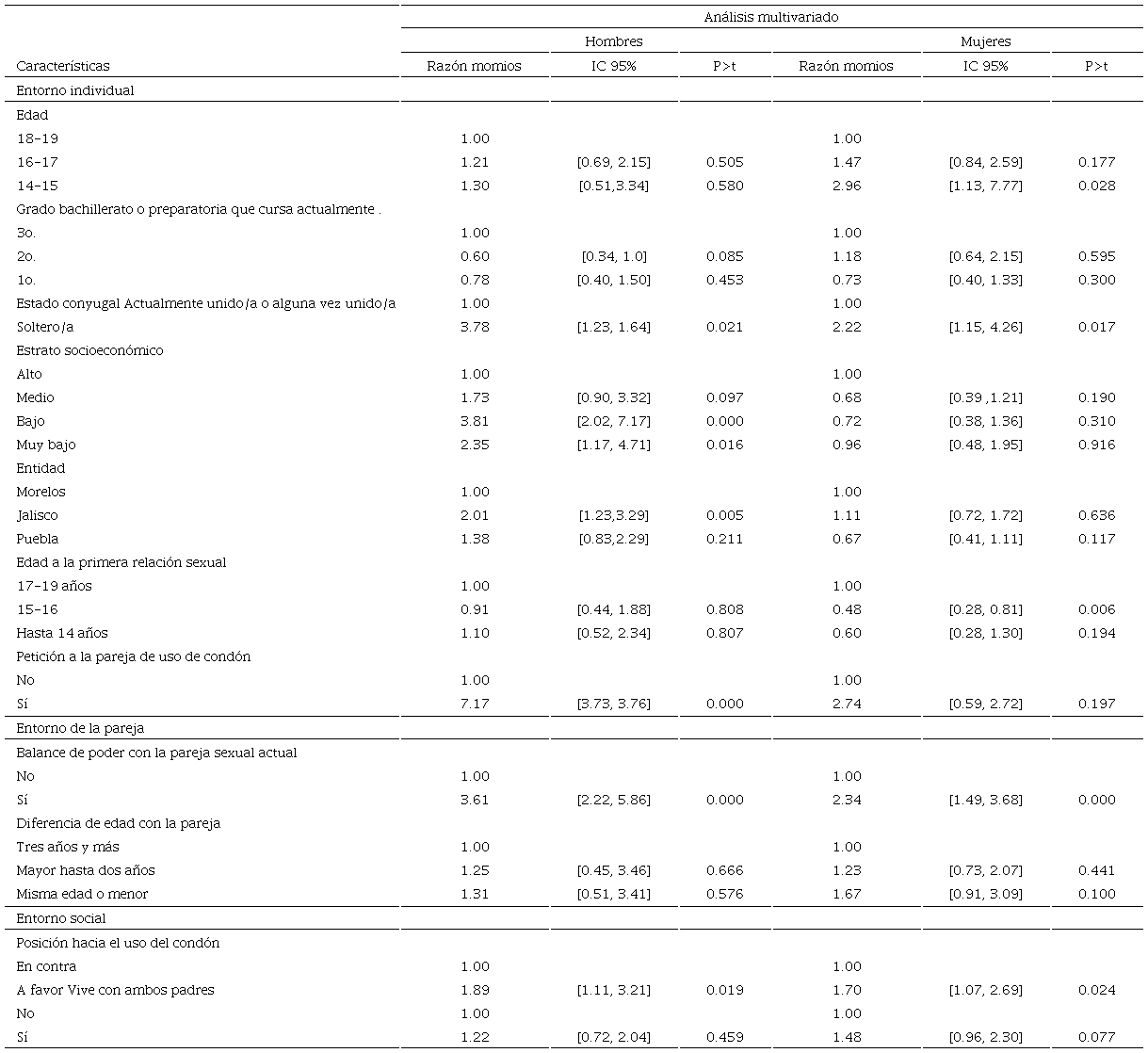 En el Cuadro 4 se analizaron por sexo los aspectos del entorno individual, de la pareja y social en su conjunto asociados con el uso del preservativo en la última experiencia sexual. En el caso de los varones, destaca que los solteros (RM=3.78, p<0.05), del sector socioeconómico bajo (RM=3.81, p<0.001) o muy bajo (RM=2.35, p<0.05), que habitan en Jalisco (RM=2.01, p<0.01), están a favor de pedirle a su pareja sexual la utilización del preservativo (RM=7.17, p<0.001), con balance de poder en su relación con su pareja sexual (RM=3.61, p<0.001), y posición a favor del uso del preservativo (RM=1.89, p<0.05), tienen más posibilidad de utilización del condón respecto a los que están unidos, de estrato socioeconómico alto, viven en Morelos, no pedirían a la pareja sexual el uso de este método, sin balance de poder con la pareja sexual, y en contra del uso del preservativo.