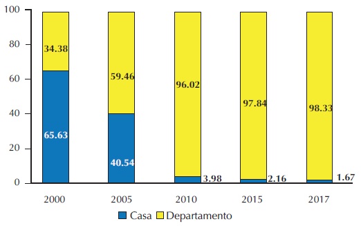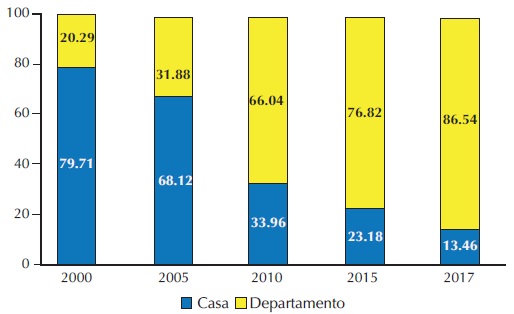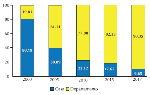Esta dinámica cambió para los siguientes quinquenios, y en 2005 se ubicaba en departamentos el 59.46% del total de la oferta inmobiliaria, mientras que la oferta de casas se reducía. Sin embargo, para 2010 esta tendencia se aceleró evidenciando un cambio abrupto en la relación entre casas y departamentos. La oferta inmobiliaria vertical de departamentos concentró en 2010 un 96.02%, dejando únicamente el 3.98% del total de la oferta en la tipología de casas. Este porcentaje y tendencia continuó para 2015 y 2017, y la vivienda en departamento concentró 97.84 y 98.33% del total (Gráfica 10).