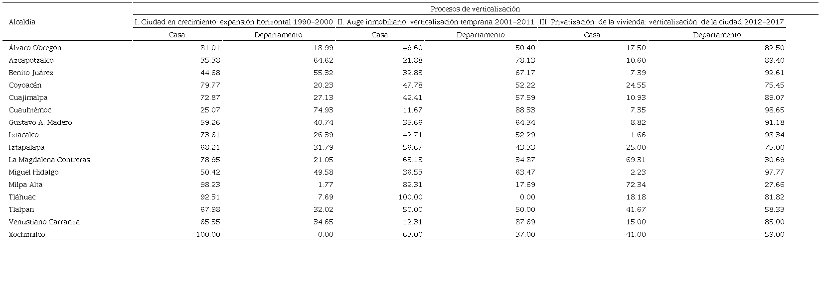 El proceso de expansión evidenció la salida de población de zonas centrales (Coulomb, 2008) y el crecimiento poblacional en alcaldías del segundo y del tercer contorno (Delgado, 1990) y de los municipios de la zona metropolitana (Lara et al., 2017; Suárez y Delgado, 2007). En este periodo, el 62% de las ofertas inmobiliarias se concentraron en la categoría de casas, mientras que el restante 38% en departamentos (Gráfica 1).