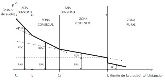 La estructura espacial de usos de suelo crea las condiciones materiales para la valorización económica de este recurso, pero ella es también el resultado de la competencia de usos que genera el mercado y que, por tanto, en cada momento el suelo tiende a destinarse a aquellos que más lo valorizan. En consecuencia, el uso y la renta del suelo se afectan mutuamente dando lugar a un juego de mercado cuyo funcionamiento genera una serie de alteraciones en los propios montos de renta y, por tanto, del precio del suelo, por lo general elevándolos, incluso a extremos que distorsionan sus propias lógicas.