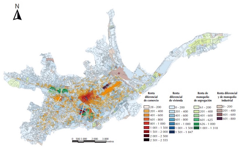 Las rentas diferencial y de monopolio industrial son rentas secundarias, en principio diferenciales, y soportan los espacios urbanos que acogen esta producción, ofreciendo mejores condiciones en cuanto a la provisión de bienes, servicios y accesibilidad. No obstante, todo indica que ellas tienden a volverse homogéneas en la ciudad y a disminuir su relevancia. El suelo tenderá a soportar una renta de monopolio si adquiere importancia la localización obligada de la industria en espacios urbanos por regulaciones en materia ambiental y la posibilidad de prodigarse oportunidades y servicios a los que una industria en particular difícilmente puede acceder (Jaramillo, 2009).